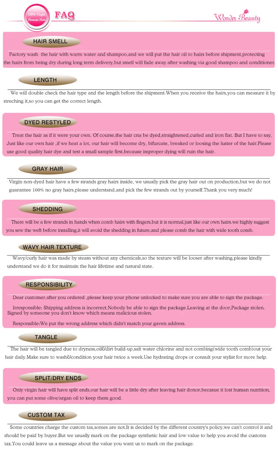Peruvian Virgin Human Hair Straight With Closure 3 Bundles Wonder Beauty Straight Hair With Middle Free Three Part Lace Closures 1)Material: 100% Unprocessed human hair 2)Grade: Brazilian virgin hair body wave 3)Color : no dyed natural black hair #1b 4)Quality: no shedding, no tangles, no lices, can be dyed to #27 5)Length:8-30 inches available ,you can choose any mixed length 6)Style:body wave/water wave/deep wave/deep curly/loose wave/curly/tight curly/afro curly /kinky curly/straight/loose curly 7)Packing: for small order, we will pack with plastic bags; for bulk order, we will pack goods according to your requirements, packing with your brand and logo if you want. 8)Processing time: Usually Ship the order Within 24 hours except for weekends and holiday
