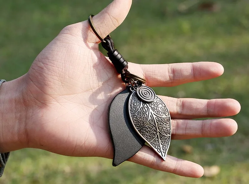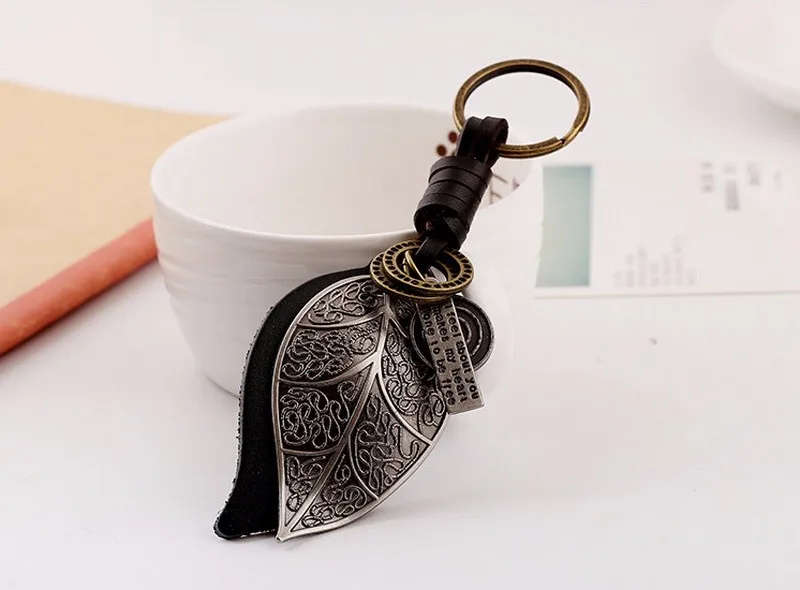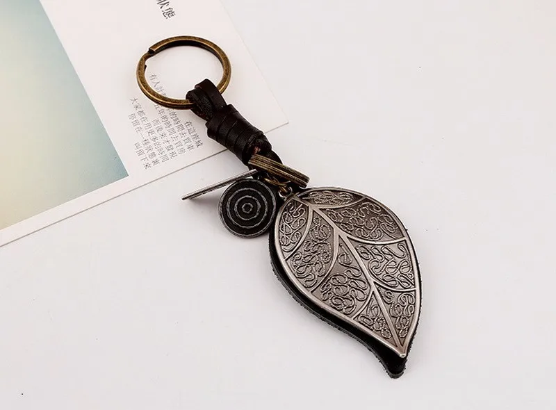 HAVARIA Punk Art Genuine Leather Cut out men women keychain bag pendant Alloy leaves Car key chain ring holder Jewelry pkys-001