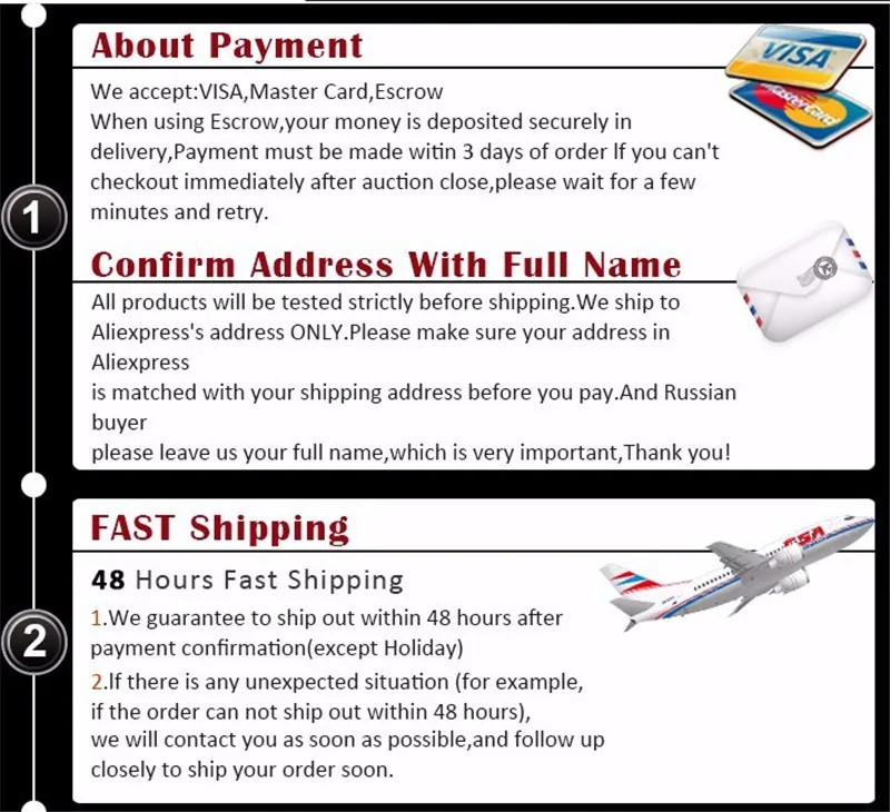 Please double confirm your full name (especially Russian friends), address(Street, City, State, Country), post code, phone number before place an order.