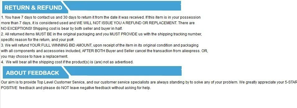 If you have any problems with our items or services, please contact to us first before you leave negative feedback. We will do our best to solve any problems and provide you with the best customer service.