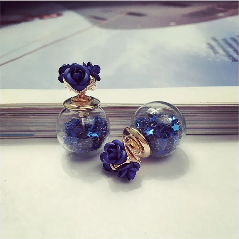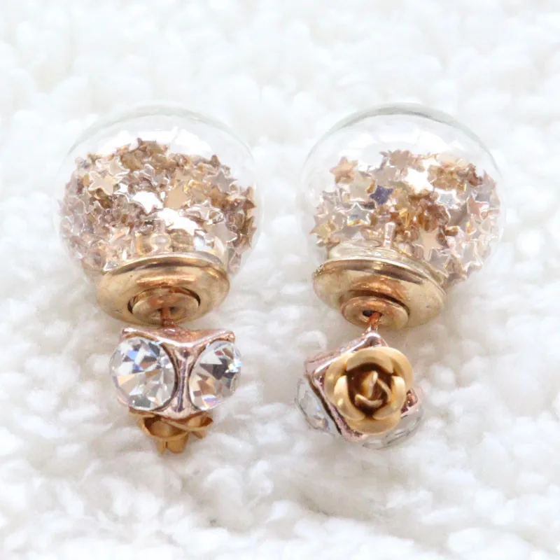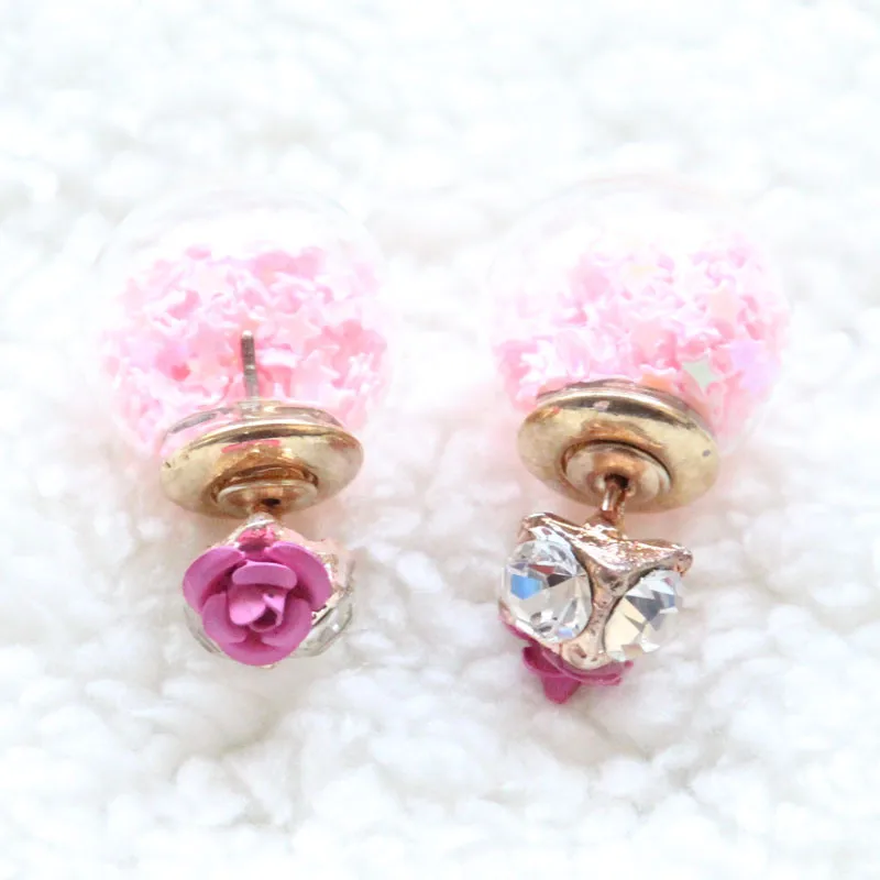 Fashion Korea Rose Flower Wishing Star Pearl Earrings Glass Crystal Ball Double Sided in Stud Earrings For Women Fine Jewelry
