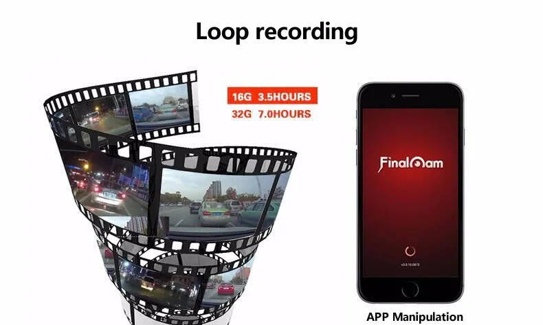 - Novatek 96655, Loop Recording, powerful IC, Loop Recording, you can set the video fragment as 1minute / 2 minutes / 3 minutes, overwrite the fragments recorded before, if the storage is full . Support 8G - 32G Micro SD card .