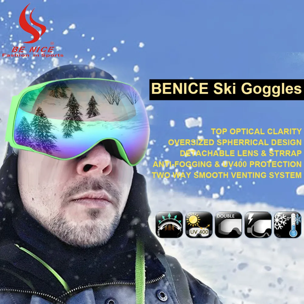 Be Nice Brand Professional Ski Goggles PRO - Frameless, Interchangeable Lens 100% UV400 Protection Snow Goggles for Men & Women