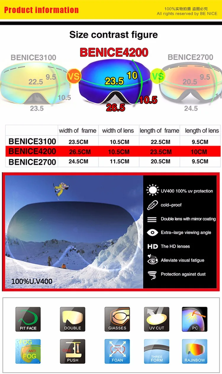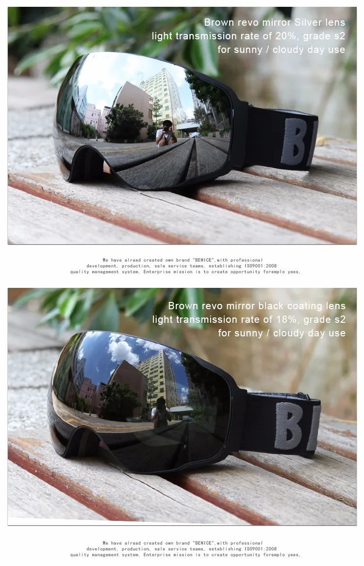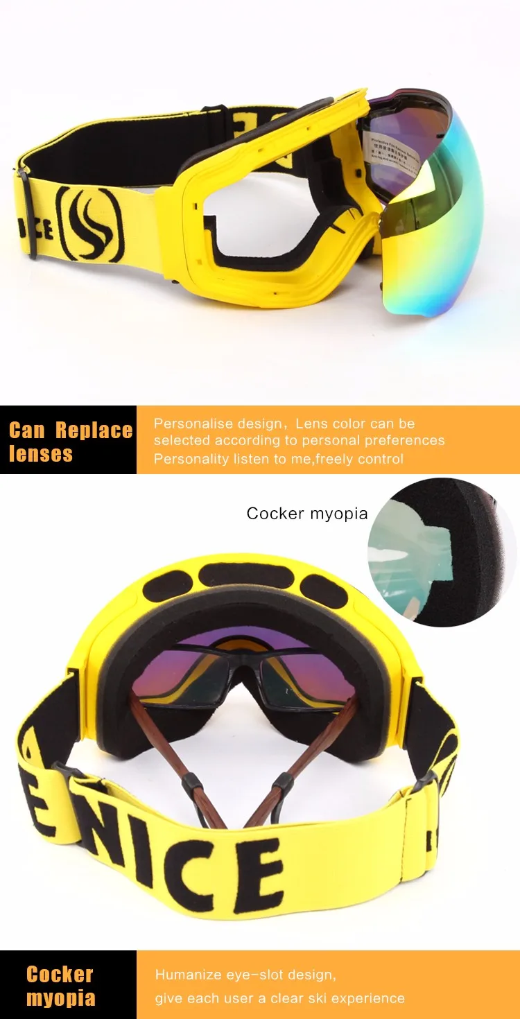 Benice New Design Ski Goggle Snow Glasses /UV- Protection Multi-Color double anti-fog lens Snowboard Skiing Goggle with free bag
