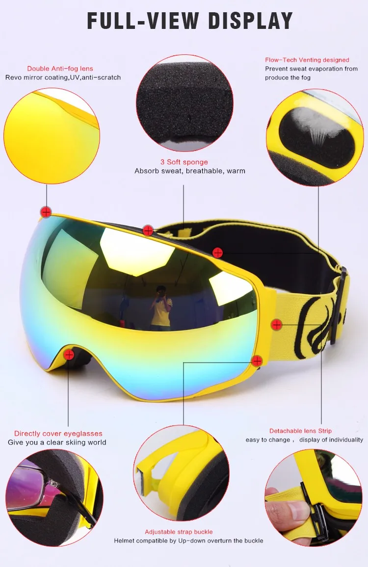 SKI GOGGLES WITH TOP OPTICAL CLARITY - Italian-made inner lens with cutting-edged fog free coating. Oversize rimless design and spherical shaped lens provides the widest and clearest view on the slope. REVO MIRROR REFLECTION - Super cool outer lens with UV400 protection finish and full REVO mirror coating deliver top-grade eye protection and selfie with real view reflected on the lens surface.