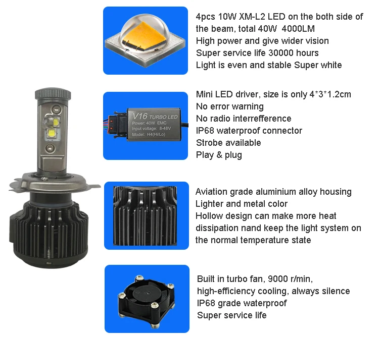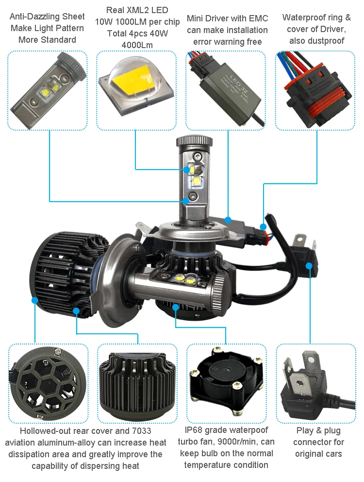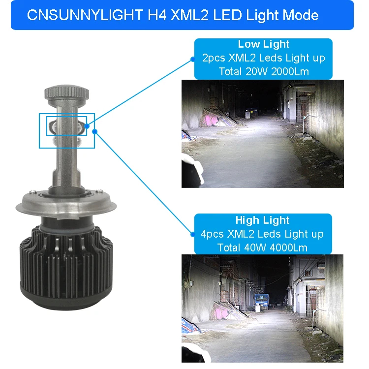 - Light source: Built with 4pcs XML2 Chips LED for H4, 2pcs MKR chips led for Single beam