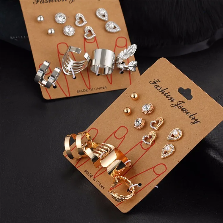 17KM 8 pcs/ set New Gold Color Crystal Heart Earrings for Women Silver Color Water Drop Leaf Rings Engagement Jewelry Set