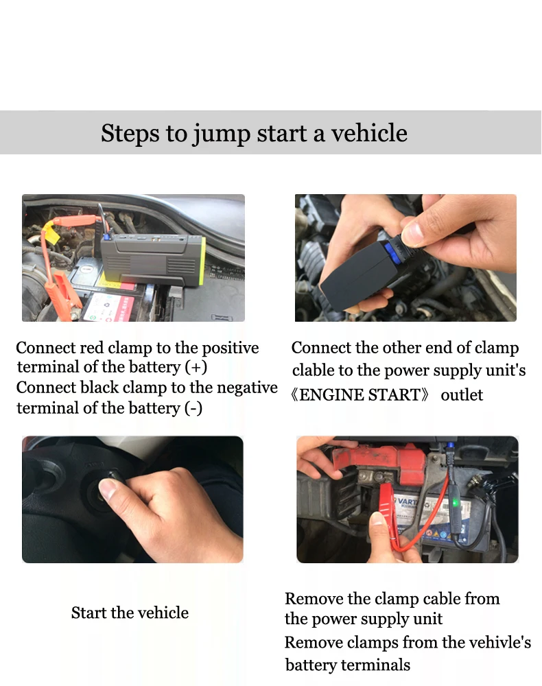 2. This product can jump start gasoline car displacement up to 3.5L, but may not jump start diesel cars. please contact us if you have any other question.