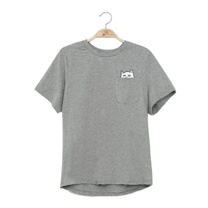 Women T Shirt 2015 Summer Style T-shirt Print Middle Finger Pocket Cat Harajuku O-neck Short Sleeve Cotton Couple Tee Plus Size