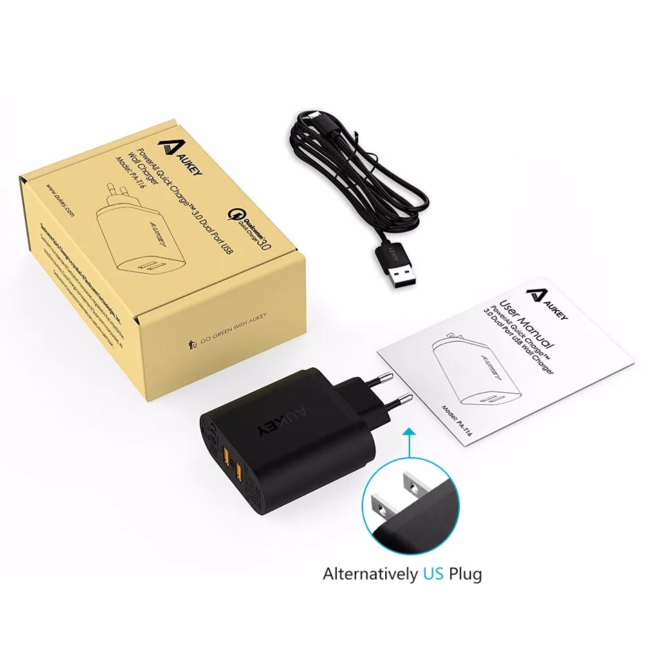 Package Contents: AUKEY PA-T16 Dual-Port USB Wall Charger,Free 1x Micro USB cable( Length: About 1m) or you can choose the cables you need,User Manual, Warranty Card.